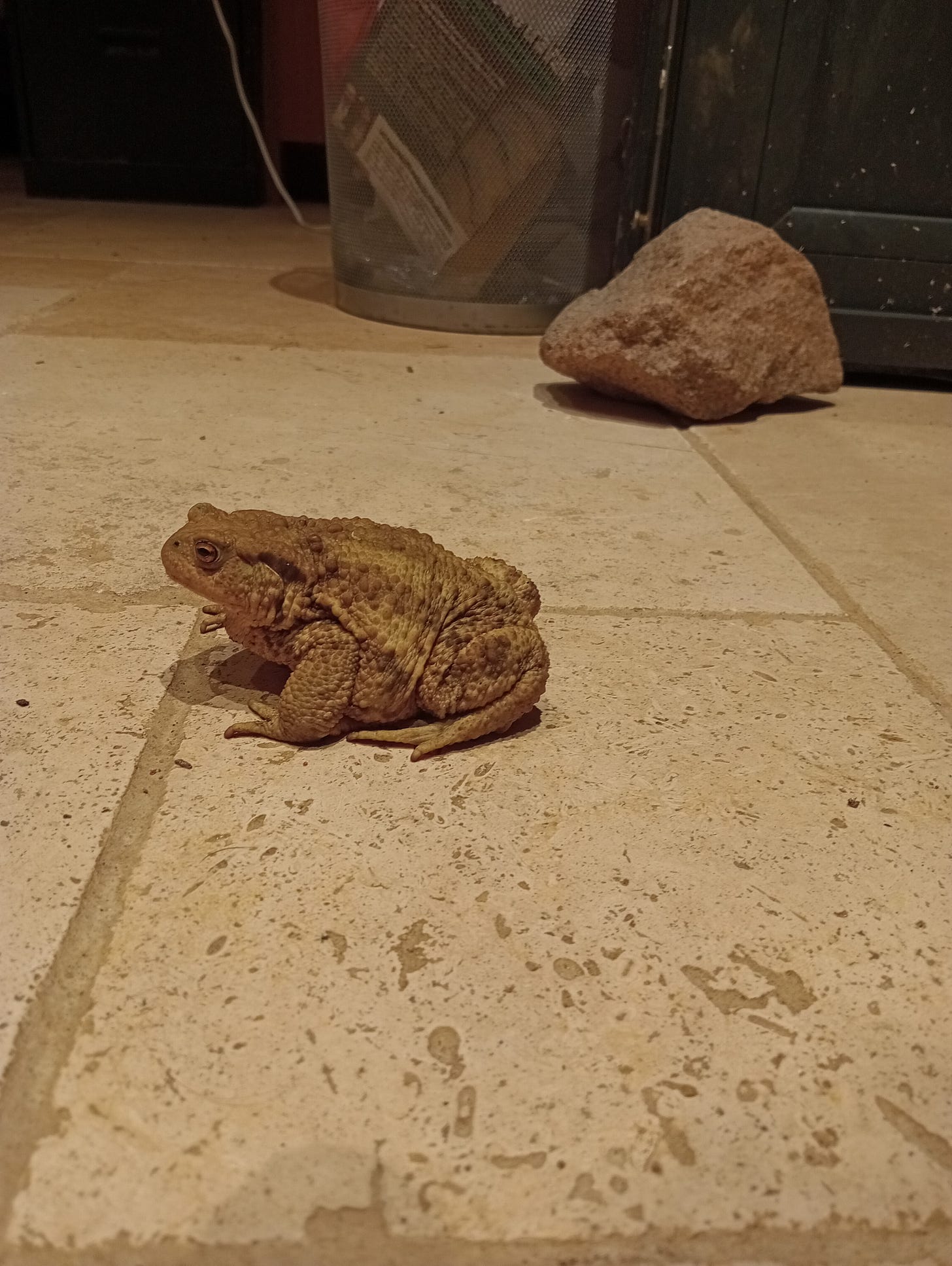 There was about a month where toads were active around the house, including the one who walked in. I need to drain the stand pipe that goes into the big guy's home. I'll be sure to check on him. The frogs disappeared about five years ago.